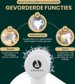 Apeiron Elektrische Schoonmaakborstel – Poetsmachine – Poliermachine – Schrobborstel – Handborstel – Werkborstel – Schrobber – Boorborstel – Wasborstel – Schoonmaakmiddelen – Reinigingsborstel – 3 Opzetstukken