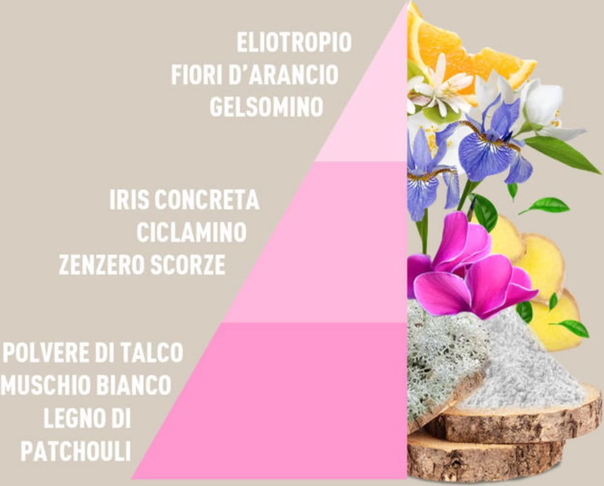 • Geurmix van oranjebloesem, talkpoeder, jasmijn, iris, musk en patchouli hout.