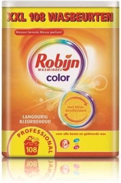 Robijn Color is speciaal ontwikkeld om alle gekleurde kleding te wassen. Robijn heeft een unieke formulering met kleurbeschermers, deze beschermt de vezels en de kleuren, zodat deze langer mooi blijven. Niet voor niets zegt Robijn wat mooi is moet mooi blijven. Ook na veelvuldig wassen! Dit pak heeft een gewicht van 6,156 kilogram en is goed voor 108 wasbeurten.