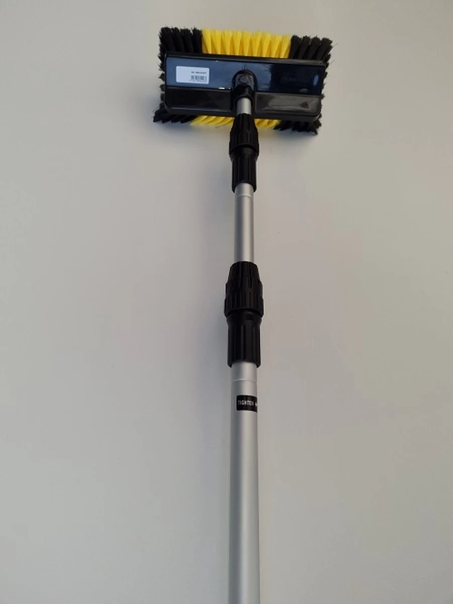 Autowasborstel of Zonnepaneelwasborstel met waterdoorvoer. De zachte, gepluimde PBT vezel van 0,25mm dik en 55mm lang is uitstekend geschikt voor het wassen van auto’s, zonnepanelen en andere gevoelige, waterbestendige oppervlakken.